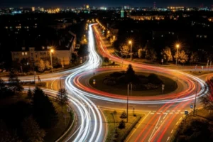 • Rampas em espiral iluminadas: com longa exposição, os faróis dos carros criam rastros circulares que parecem obras gráficas.